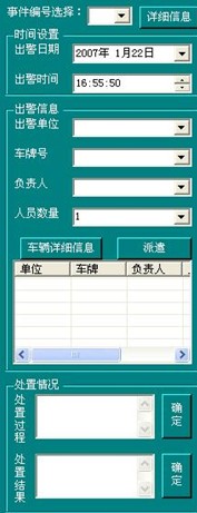 1 接警:接警系统供应急办接警人员使用。当接到新的警情,使用人员按照系统里列出的栏目将相关信息一一填入,并根据报警人员的描述,在地图上标示出事故发生地,点击“信息录入”按钮后系统将这些信息自动发送至各单位,各单位通过获取的信息进行出警任务的布置。